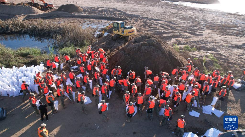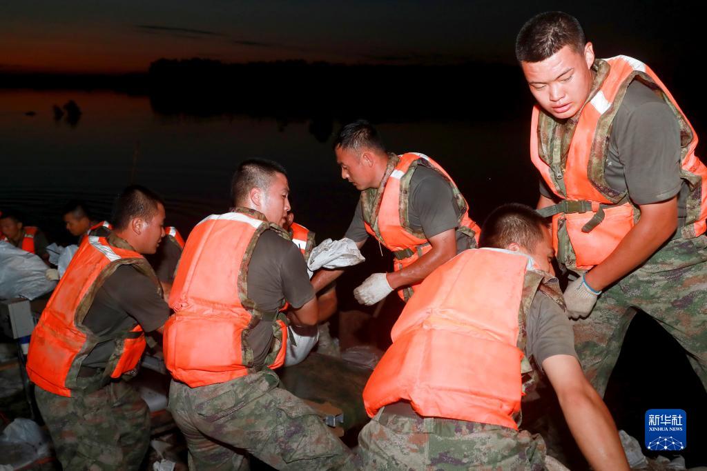 北部战区陆军某旅官兵在扶余市弓棚子镇拉林河下游执行抢险任务(8月13日摄)。新华社发(李朝阳 摄)