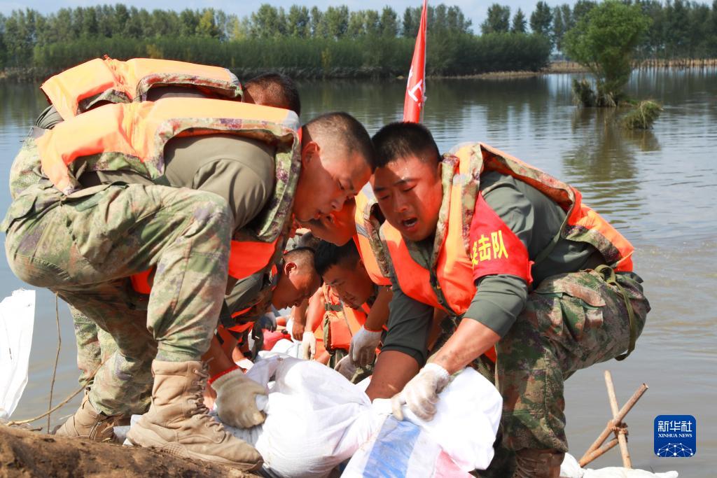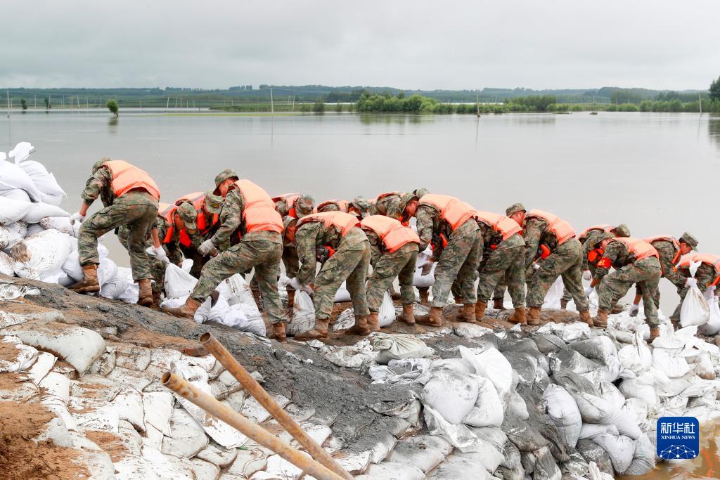 北部战区陆军某旅组织官兵在榆树市拉林河青山段进行堤坝加固作业(8月16日摄)。新华社发(郑人恺 摄)