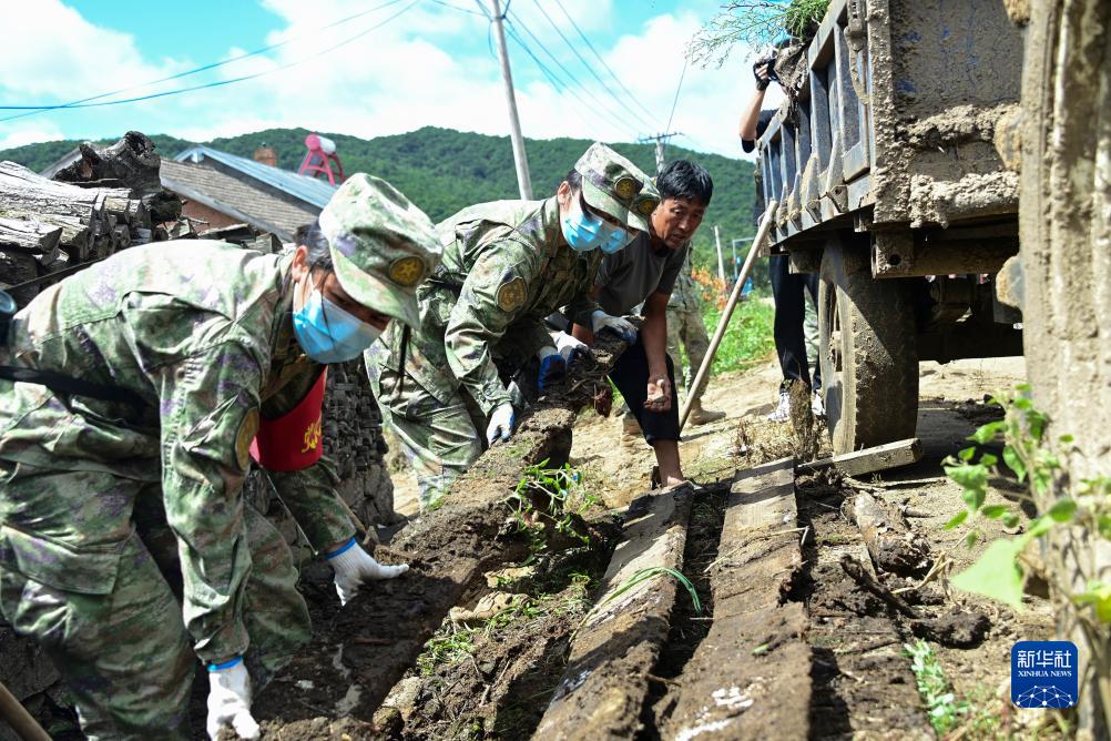 北部战区陆军某旅在牡丹江宁安市沙兰镇二吕村参与灾后重建工作,党员突击队帮助村民清理杂物(8月15日摄)。新华社发(任佳宝 摄)