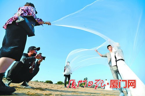 释放蓝海潜力,还体现在海洋经济的蓬勃发展。我市积极探索以“美丽海湾”建设为依托的生态产品价值实现方式。在保护海洋生态、发挥旅游功能价值的同时,大力发展海洋产业,优化海洋经济结构。在总用地面积仅1.34平方公里的观音山片区,已累计完成固定资产投资150亿元以上。因地制宜将溪头下小渔村改造提升为“中国最浪漫婚纱村”,培育形成年产值超10亿元的婚纱摄影产业链。打造沙坡尾海洋文化创意港,成为一座传统与现代融合、兼具渔港文化韵味和多元建筑风格的“活态博物馆”。风景优美的海滨浴场和沙滩,成为厦门马拉松赛、沙滩排球赛、沙滩风筝节、观音山音乐节等文体赛事活动的热土。