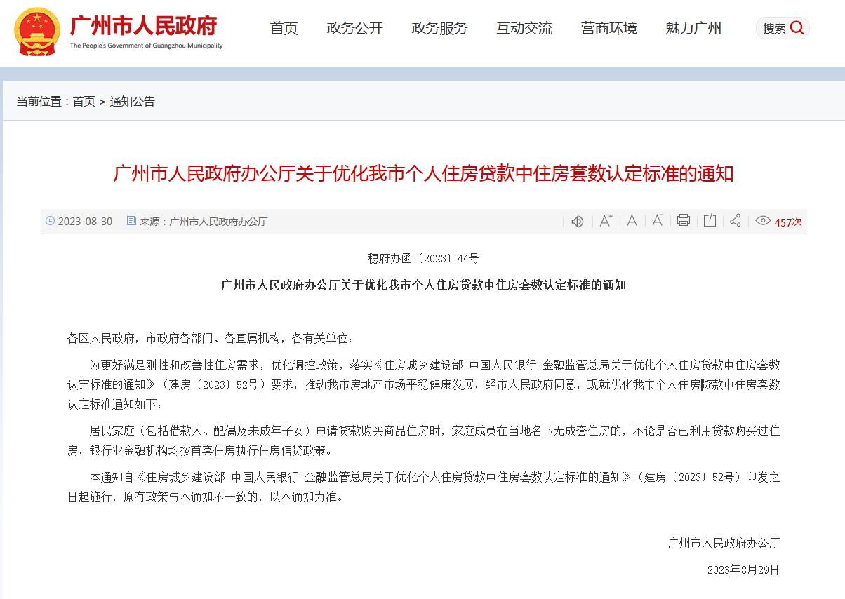 中新网8月30日电 据广州市人民政府网站消息,30日广州市人民政府办公厅发布关于优化广州市个人住房贷款中住房套数认定标准的通知。
