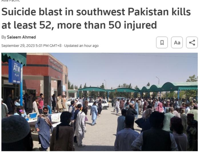 中新网9月29日电 据路透社报道,当地时间29日,巴基斯坦俾路支省马斯通地区的一个市场发生爆炸,目前已造成至少52人死亡,数十人受伤。