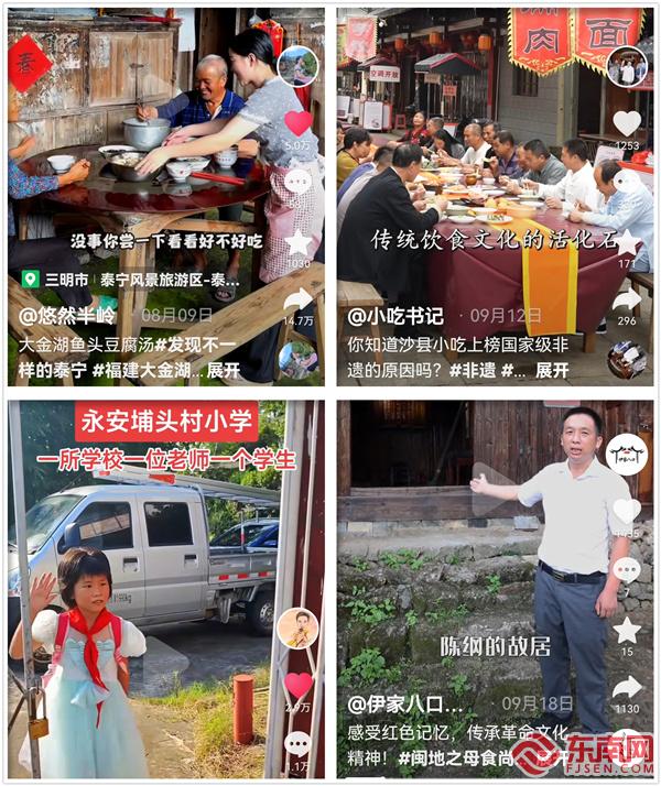 《回家看看》短视频,获赞2万多,让网友仿佛“回到了小时候”;“农村田园生活”系列短片,让网友艳羡向往,点赞“都是熟悉的感觉”……其中,一条是来自泰宁网红“悠然半岭”的作品冲上热点,点赞量超5万,转发量超14万。该视频以关爱老人为主题,向网友介绍了大金湖鱼头豆腐汤的制作方法。网友点赞“小姐姐的三观真的太好了,是个正能量的博主”“可以和朋友一起去泰宁玩下”……