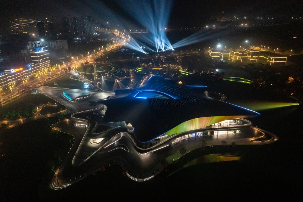 这是10月16日晚拍摄的2023成都世界科幻大会主场馆——成都科幻馆(无人机照片)。新华社记者 沈伯韩 摄