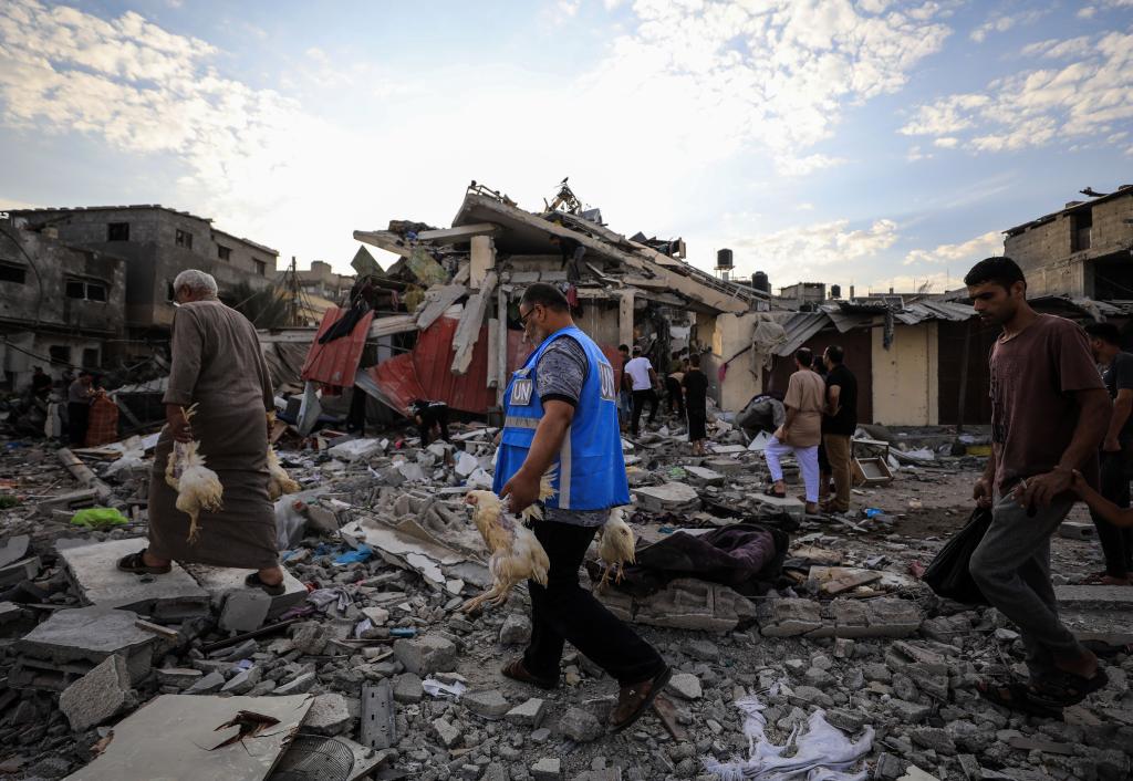 10月27日,在加沙地带南部城市汗尤尼斯,人们经过以军袭击后的房屋废墟。新华社发(亚西尔·库迪摄)
