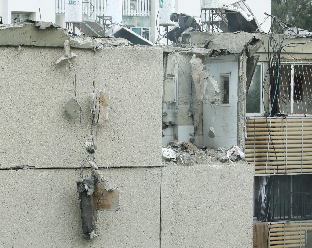 这是10月27日在以色列特拉维夫拍摄的遭到火箭弹袭击的受损建筑。新华社发(吉德翁·马科维奇摄/基尼图片社)