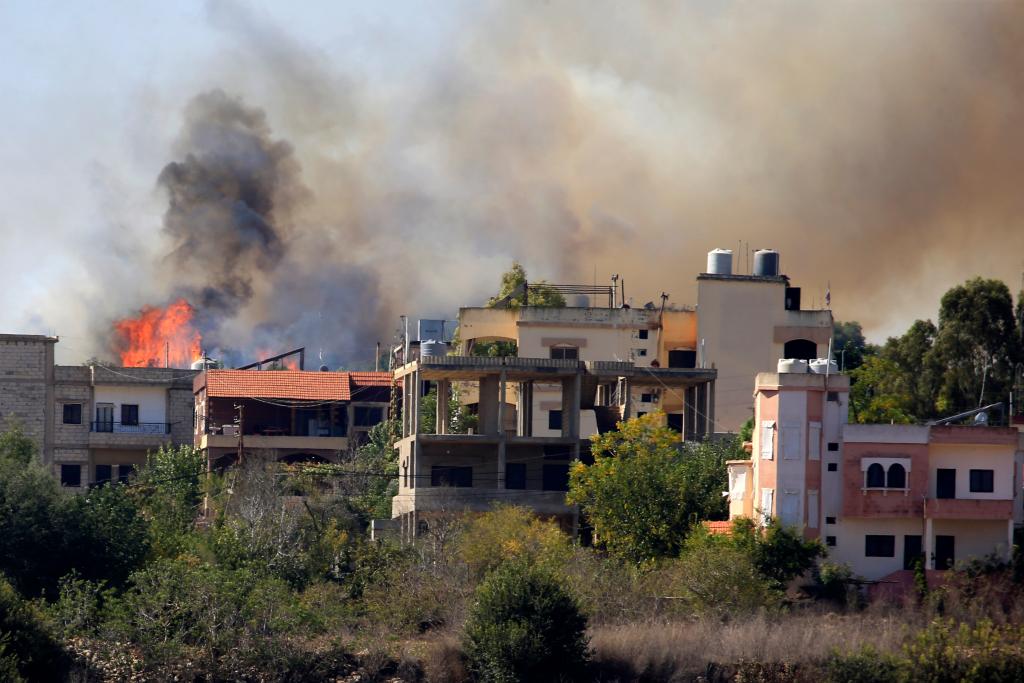 10月26日,在黎巴嫩艾塔沙卜,一处居民区遭炮击后起火。新华社发(阿里·哈希绍摄)