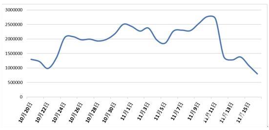 在10月20日至11月16日共计28天监测期内,共收集到“消费维权”相关信息56,753,335条,日均约202万条。舆情走势平稳,11月10日信息量达到峰值,为2,767,910条。10月24日、31日均出现小幅增长。