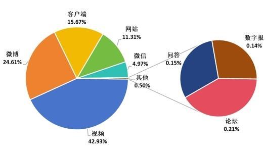 在信息传播渠道上,“消费维权”类信息传播渠道主要有视频、微博、客户端、新闻网站、微信、论坛等。其中视频信息量最高,占比42.93%;其次是微博,占比24.61%;第三是客户端,占比15.67%。