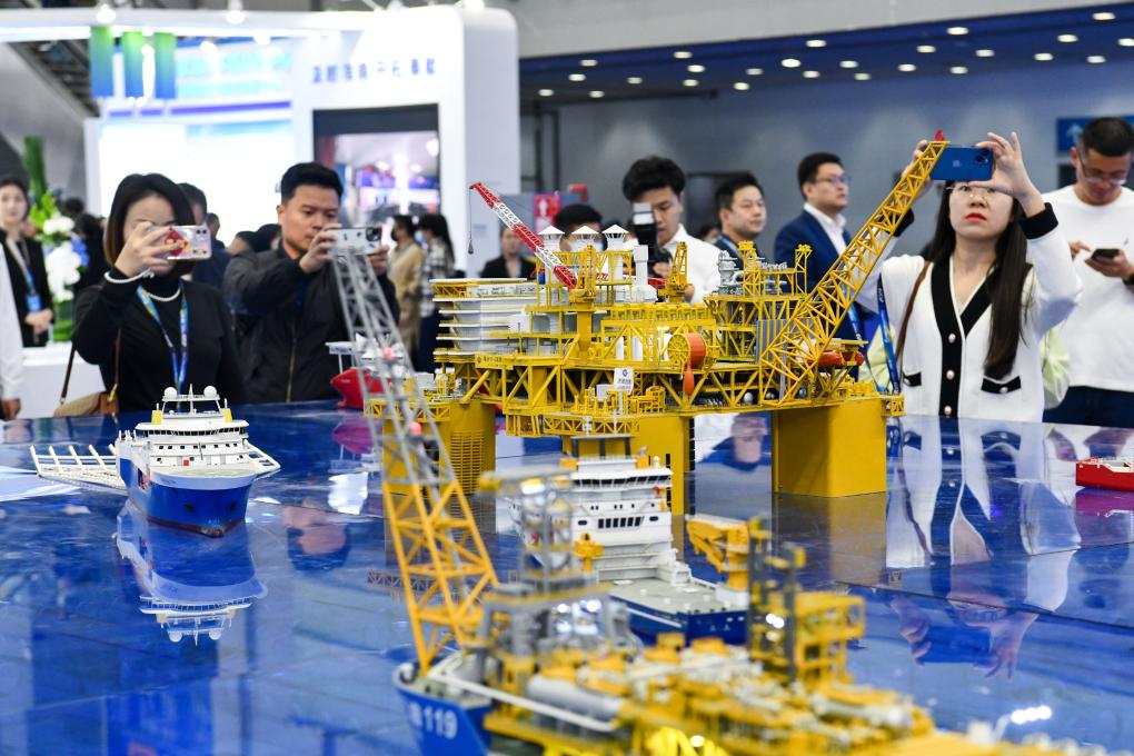 11月23日,观众在现场观看中国海油深水油气田勘探开发模型。(新华社记者 梁旭 摄)