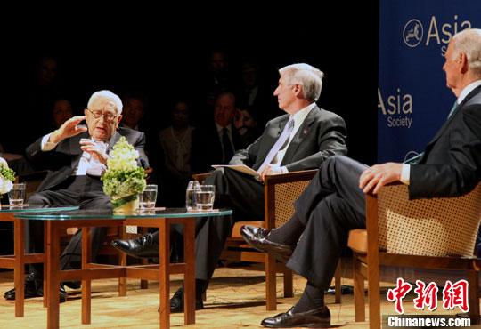 资料图:美国前国务卿亨利·基辛格(左)与前国务卿詹姆斯·贝克等人进行有关美中关系的对话。中新社发 王欢 摄
