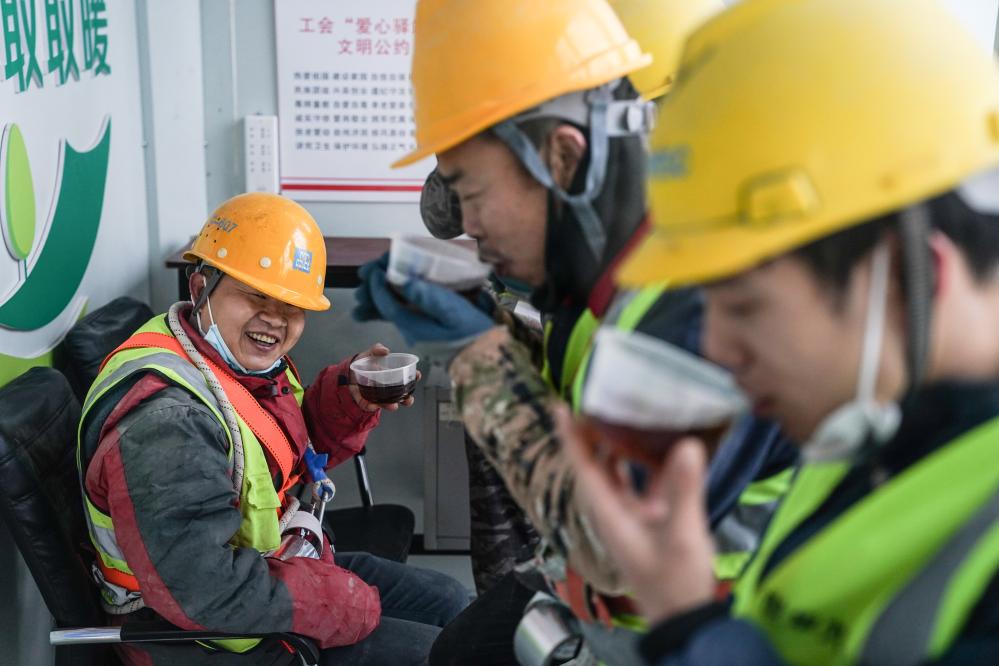 12月12日,在位于北京市海淀区的一处工地上,工人在喝姜茶驱寒。新华社记者 彭子洋 摄