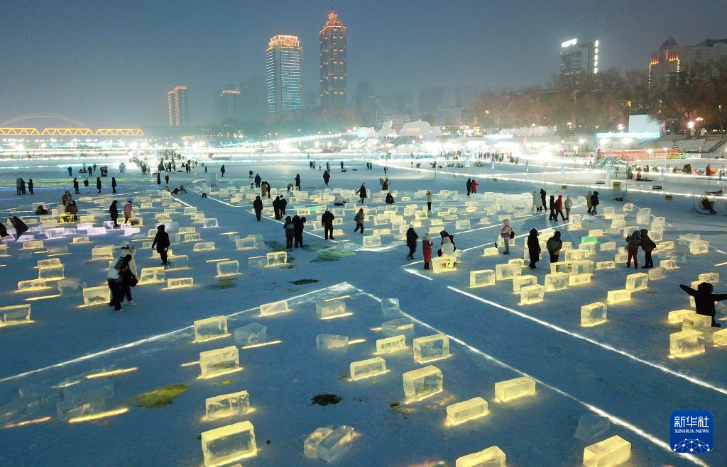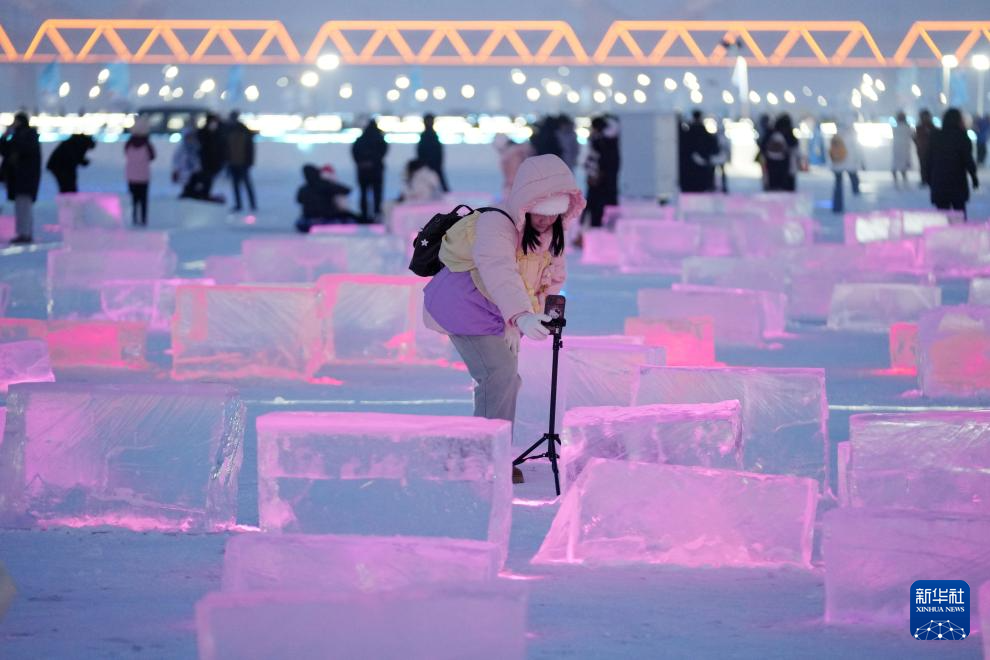 近日,在哈尔滨松花江冰雪嘉年华景区江面上,一处由冰块和灯光组合成的开放式“冰光秀场”亮相,吸引游客前来游玩、拍照。