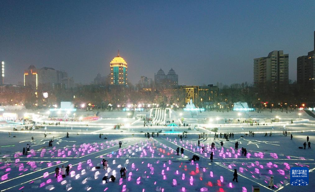 游客在哈尔滨松花江冰雪嘉年华景区的“冰光秀场”游玩、拍照(无人机照片,1月3日摄)。