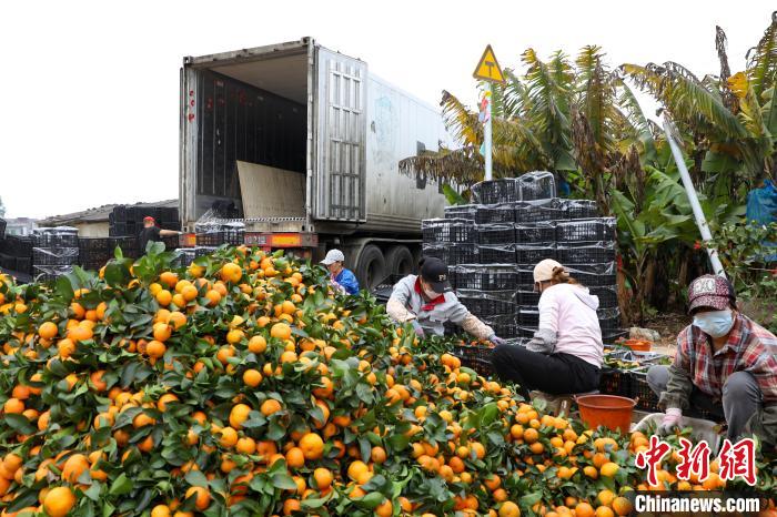 1月5日,在广西南宁市西乡塘区坛洛镇同富村,村民分拣刚采摘的砂糖橘。眼下正是砂糖橘成熟的季节,当地农民忙着采摘上市。(资料图) 中新社记者 王伟臣 摄