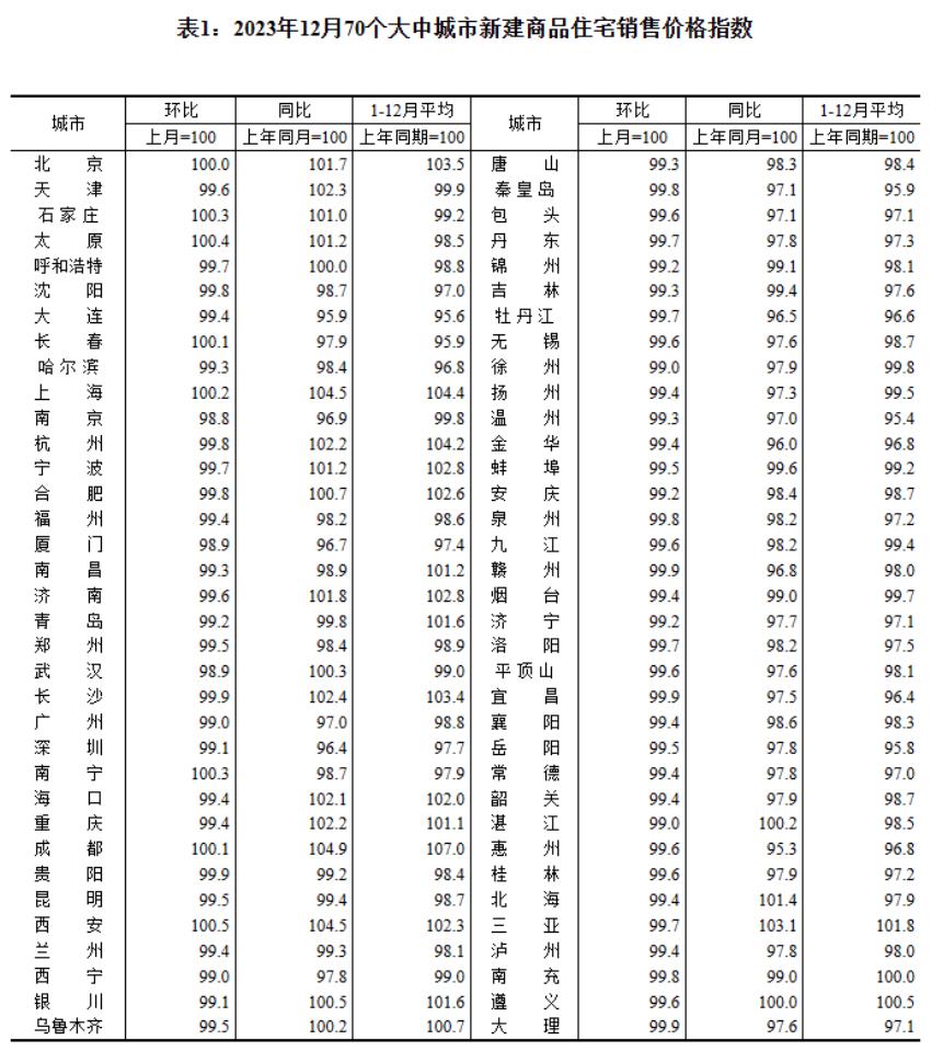 中新网1月17日电 1月17日,国家统计局公布的数据显示,2023年12月份,70个大中城市中,各线城市商品住宅销售价格环比下降、同比有涨有降。