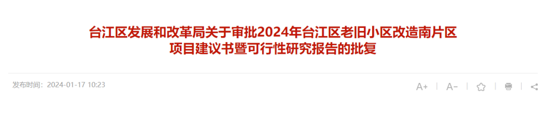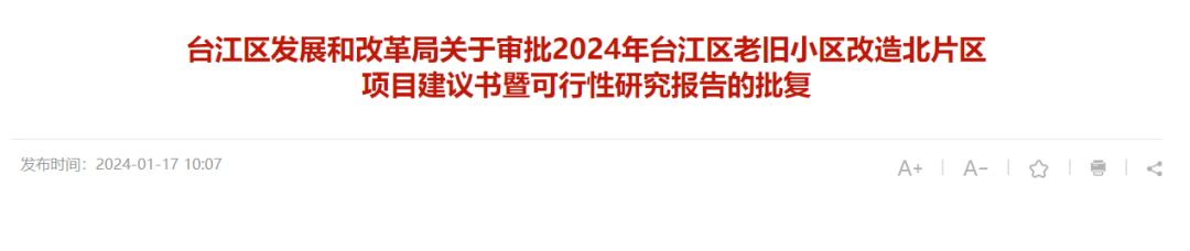 日前,福州市台江区发改局发布关于2024年台江区老旧小区改造南、北片区项目建议书暨可行性研究报告的批复。