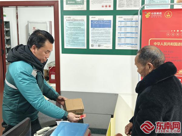 退役军人吴大爷在大龙乡客货邮供融合服务站寄快递享受到了折扣优惠。
