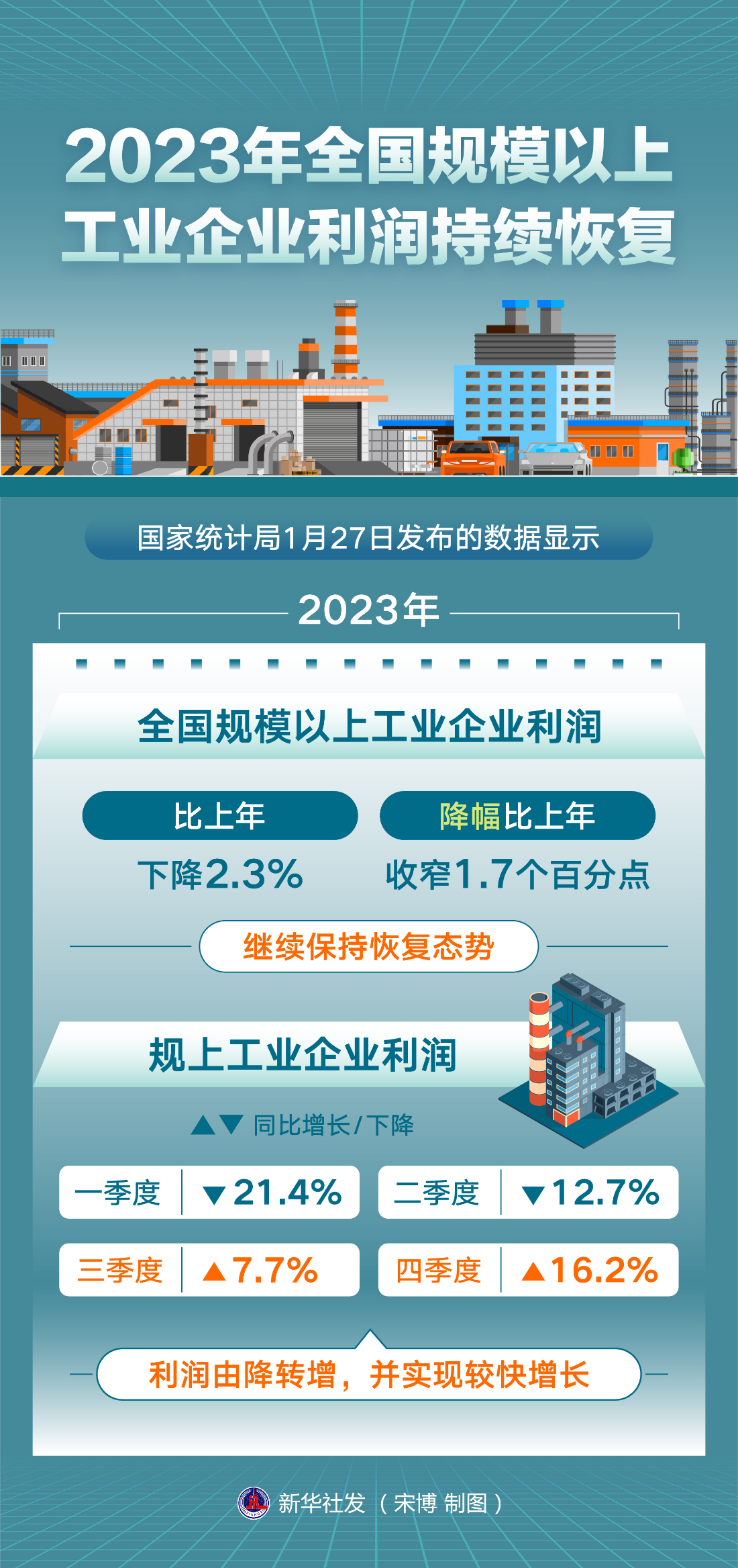 新华社北京1月27日电(记者魏玉坤)国家统计局27日发布的数据显示,2023年,全国规模以上工业企业利润比上年下降2.3%,降幅比上年收窄1.7个百分点,继续保持恢复态势。