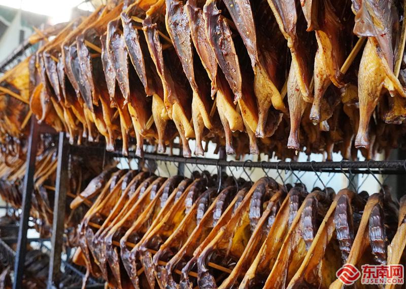 腊月时节,走进三明市沙县区郑湖乡界,家家户户开始制作板鸭,处处可见一排排金黄透亮的板鸭晾晒在院子里、屋檐下。清风吹过,阵阵飘香扑鼻的腊味迎面而来,令人垂涎欲滴。