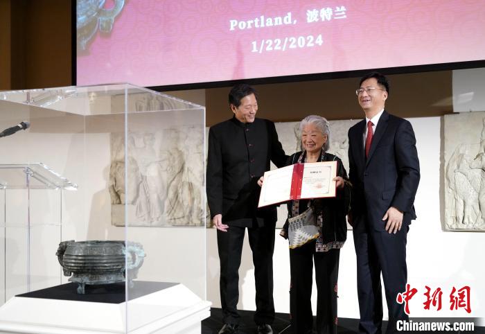 中国驻旧金山总领馆总领事张建敏代表国家文物局为雷蒙德·金及其母亲颁发捐赠证书。 国家文物局供图