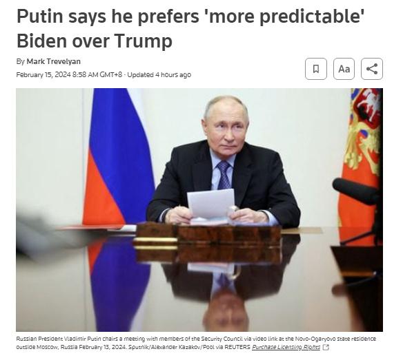 据报道,这是普京首次公开评论2024年美国大选。当被问及两人谁当选对俄罗斯“更有利”时,普京回应:“拜登,他更有经验、更有预见性,是一位老派政治家。”