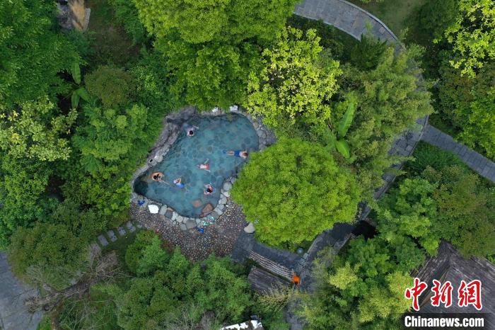 航拍民众在贵州石阡古温泉景区泡温泉。瞿宏伦 摄