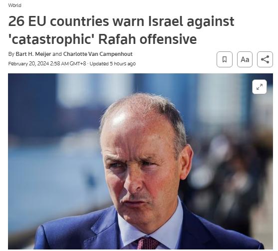 中新网2月20日电 据路透社消息,当地时间2月19日,在比利时布鲁塞尔举行的欧盟外长会议上,除匈牙利外的所有欧盟国家都警告以色列不要对拉法发动进攻。