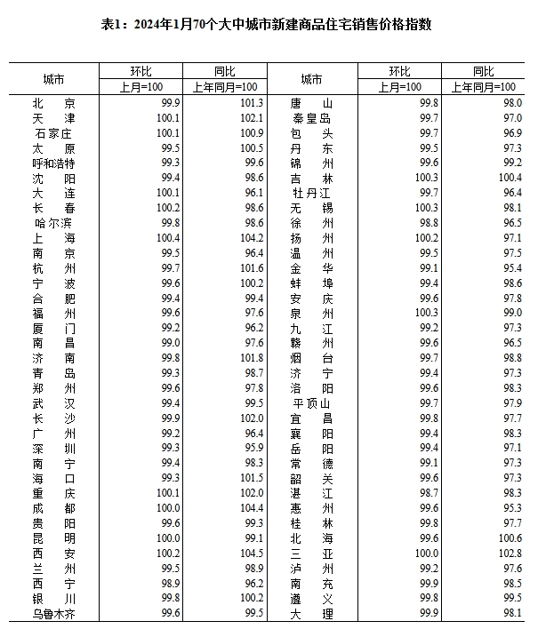 中新网2月23日电 国家统计局网站发布2024年1月份70个大中城市商品住宅销售价格变动情况。国家统计局城市司统计师王中华解读表示,2024年1月份,70个大中城市中商品住宅销售价格环比下降城市个数减少,商品住宅销售价格环比降幅整体收窄、同比整体延续降势。