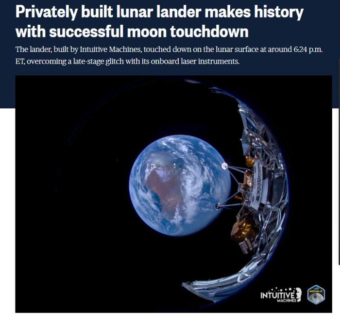 据报道,由“直觉机器” 研发的着陆器于美东时间下午6点23分左右降落在月球表面。该着陆器是自1972年“阿波罗17号”任务以来第一艘登上月球的美国航天器。