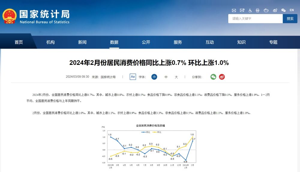 原标题:2024年2月份居民消费价格同比上涨0.7% 环比上涨1.0%