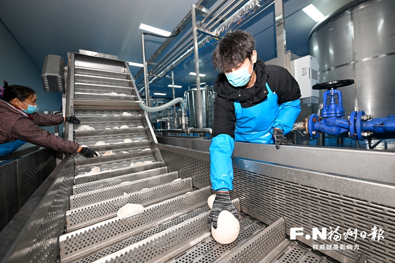 在福建淼天汇食品有限公司中印尼椰子产业园,工人们熟练地为老椰去毛、剥皮,一颗颗雪白的椰子进入生产线,经过汁肉分离等程序,产出椰子水、椰浆、椰肉等产品。