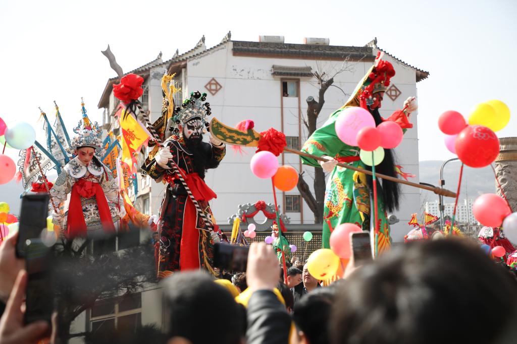3月20日,在位于天水市秦州区的天水古城,人们在观看高跷社火队队员的表演。新华社记者马希平 摄
