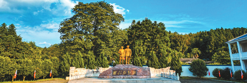 三月,细雨朦胧,黛山环抱,山鸟啁啾,四周的青松翠柏更显苍翠。眼前近一人高的基座上,立着两个金光闪闪的塑像:右为毛泽东,中分头,身着中山装,似要摆手向前迈步,面容清癯,目光坚毅;左为朱德,着军装挺立,腰佩手枪,右手搭在枪套上,抿着嘴表情严肃地眺望远方。塑像后面是屏风样的岩石群雕像:有百姓手握红缨枪、肩扛弹药箱上前线,有战士们冲锋陷阵英勇作战,还有战士和百姓交谈宣传,各具情态,栩栩如生。