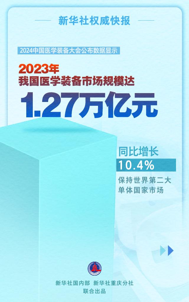 2024中国医学装备大会3月29日在重庆召开中国医学装备协会公布数据显示2023年,我国医学装备市场规模达1.27万亿元同比增长10.4%,保持世界第二大单体国家市场全年专利申请量达13.8万余件,占全球的67%中高端医疗装备生产增速加快创新医疗装备成果加速涌现质子治疗系统、ECMO、人工心脏等成功上市国产医学装备在我国医疗卫生机构的占比大幅度提高 记者:顾天成、徐鹏航、周闻韬 编辑:苗夏阳 设计:潘一景 新华社国内部、新华社重庆分社联合出品 上一篇 下一篇
