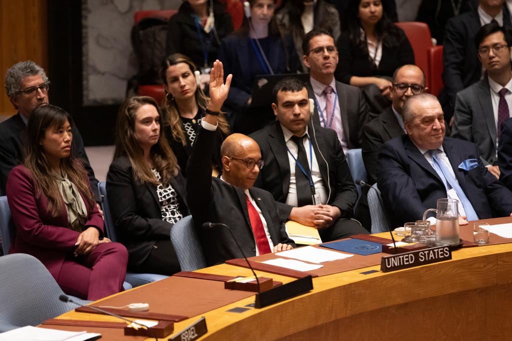4月18日,在位于纽约的联合国总部,美国常驻联合国副代表罗伯特·伍德(前左)在安理会就决议草案进行表决时投反对票。新华社记者谢锷摄