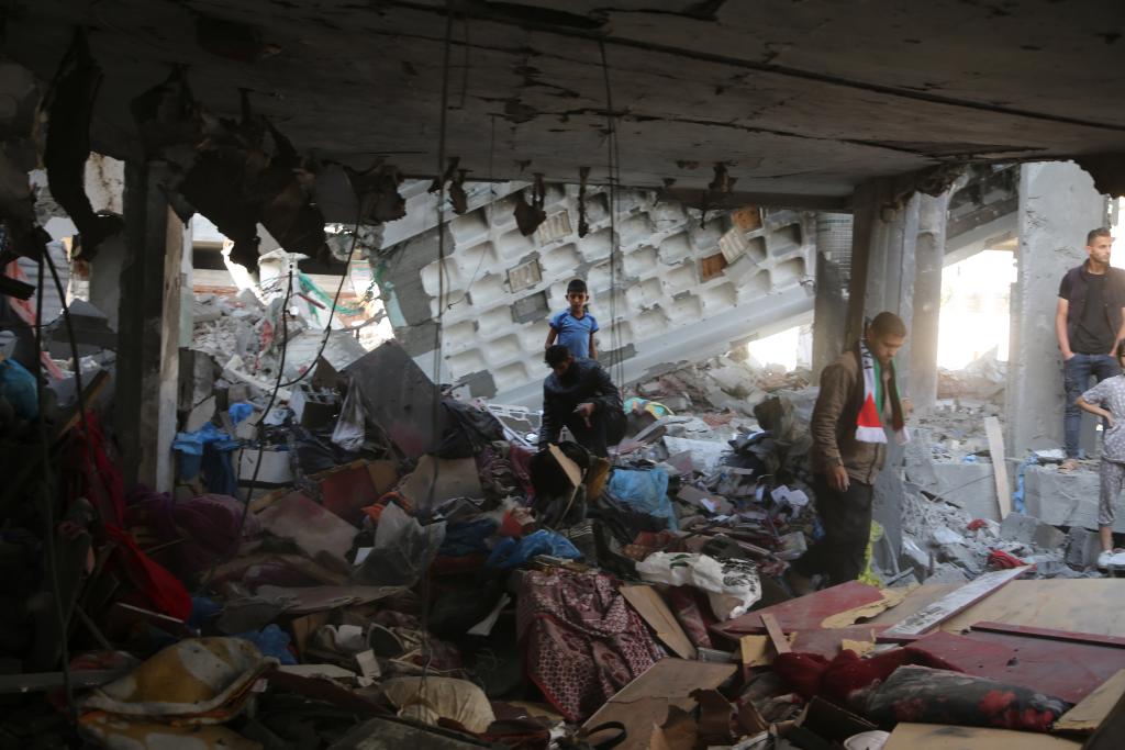 4月17日,在加沙南部城市拉法,人们查看遭以军空袭的住宅废墟。新华社发(哈立德·奥马尔摄)