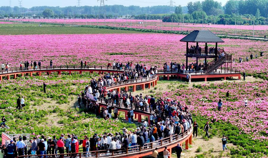 5月1日,在安徽省亳州市谯城区十八里镇蒋李村,游人在芍药花海里赏花游玩。新华社发(刘勤利 摄)