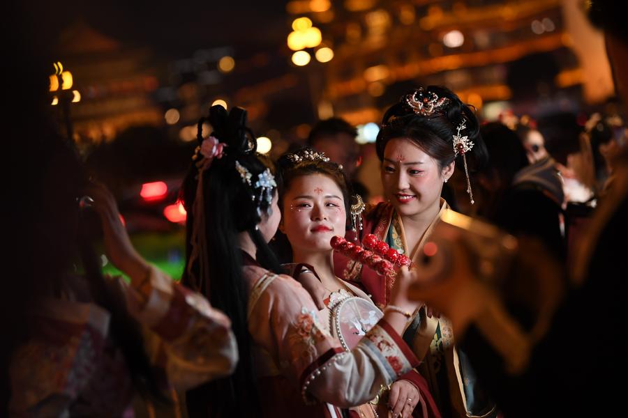 西安是十三朝古都。新华社记者闫馨禾在采访中发现,近年来,随着传统文化受到追捧,穿上唐装汉服沉浸式打卡千年古都,已经成为西安的街头风尚。“不管是在颇具古风的西安钟楼、西安城墙、大明宫国家遗址公园等传统地标,还是大唐不夜城步行街、长安十二时辰主题街区等新兴旅游景点,身着唐装汉服的年轻人随处可见,‘汉服体验’是年轻一代最热门的游玩方式之一。”闫馨禾说。