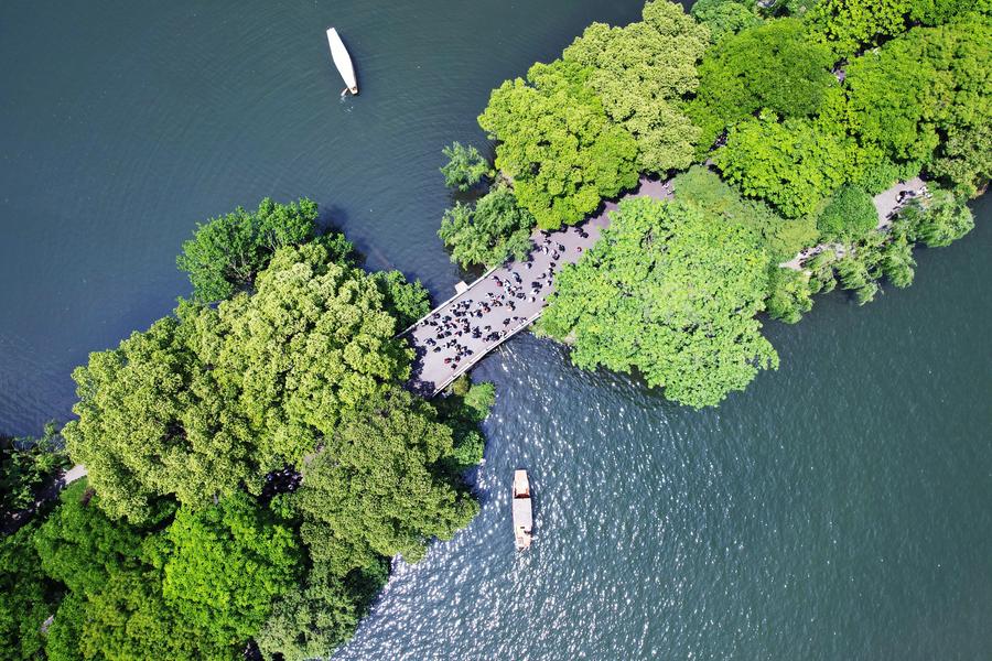 游人在杭州西湖游览(5月2日摄,无人机照片)。新华社发(龙巍摄)