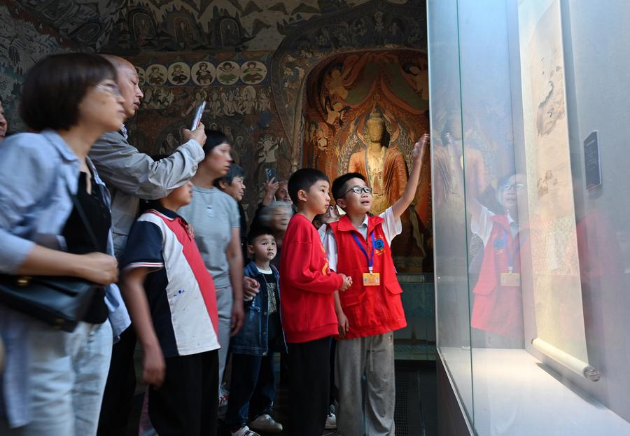 5月1日,“小小讲解员”在四川省内江市张大千博物馆为游客义务讲解。新华社发(唐明润 摄)