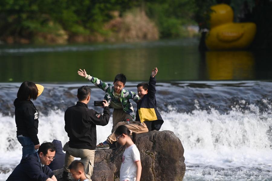 5月2日,游客在浙江省桐庐县富春江镇茆坪村游玩。新华社记者 黄宗治 摄