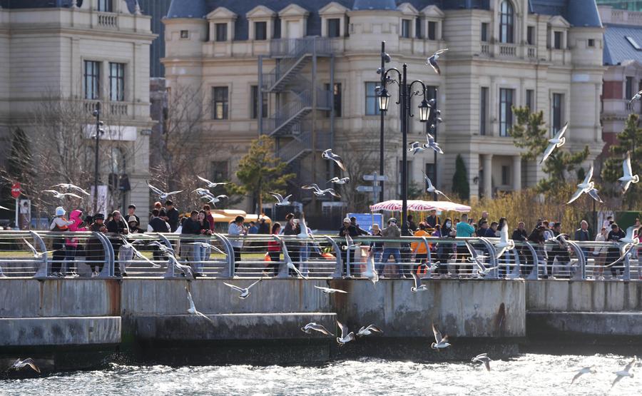 4月16日,游人在大连东港海边休闲观光。新华社记者 李钢 摄