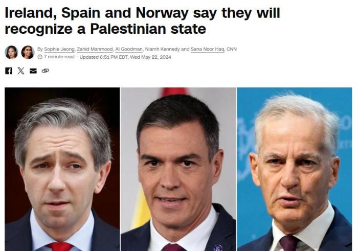 中新网5月23日电 (记者 甘甜 管娜)“今天,爱尔兰、挪威和西班牙宣布,我们承认巴勒斯坦国。”当地时间22日,挪威、西班牙、爱尔兰宣布这一重大决定,引发世界关注。