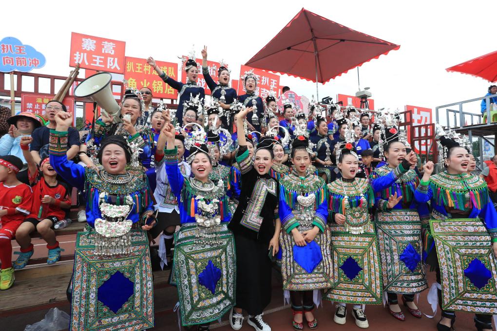 5月4日,在贵州省黔东南苗族侗族自治州榕江县“村超”球场,身着盛装的拉拉队在为本村球队加油鼓劲。新华社发(杨成利 摄)