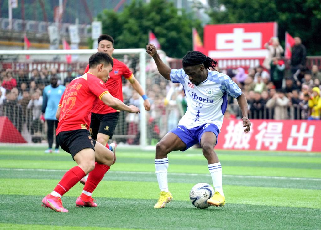 5月1日,非洲利比里亚社联足球队球员(右)与辽宁东港草莓足球队球员在比赛中拼抢。新华社发(王炳真摄)