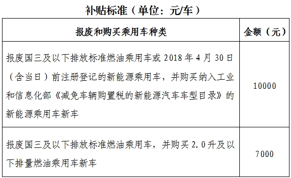 其中,对报废上述两类旧车并购买新能源乘用车的,补贴1万元;对报废国三及以下排放标准燃油乘用车并购买2.0升及以下排量燃油乘用车的,补贴7000元。