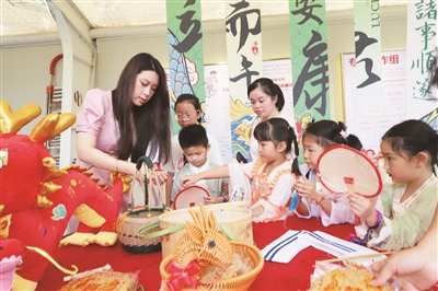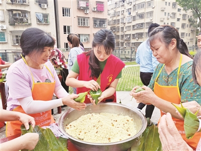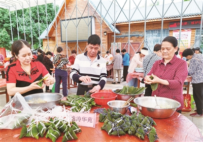 在端午节到来之际,6月4日,市政协机关联合市委文明办、东侨新时代文明实践中心举办“我们的节日·端午”——“粽情端午·和谐社区”暨兰亭社区第18届民俗文化节,各单位志愿者与社区居民一同包粽子、迎端午。 记者 陈莉莉 摄