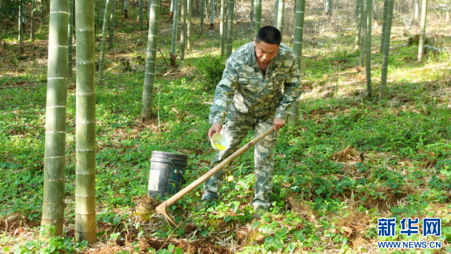 竹农谢登睿在给自家的竹林施肥。新华网 刘默涵 摄