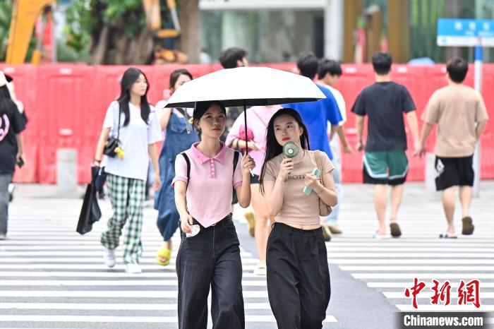 6月13日,广东广州,市民手持风扇与雨伞散热降温。 陈骥旻 摄